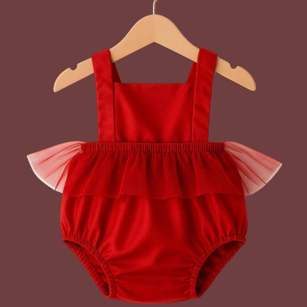 Romper infantil vermelho com alças largas e babado em tule na cintura. Confortável e delicado, ideal para ocasiões especiais.