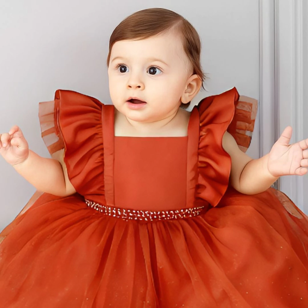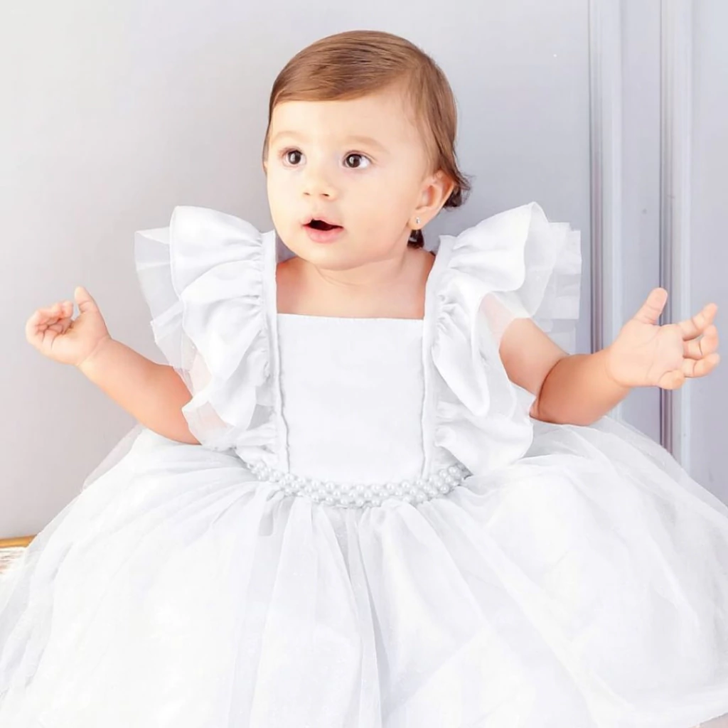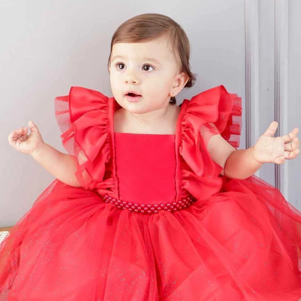 Com design sofisticado e acabamento de alta qualidade, este vestido apresenta Tule estruturado com delicados babados de tule nas mangas, que trazem volume e elegância na medida certa. A saia ampla e fluida, confeccionada em camadas de tule com brilho sutil, garante um caimento impecável e um visual encantador. O cinto de pérolas na cintura adiciona um toque de delicadeza e charme.