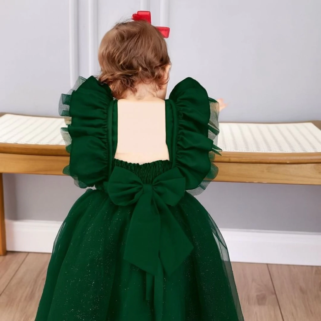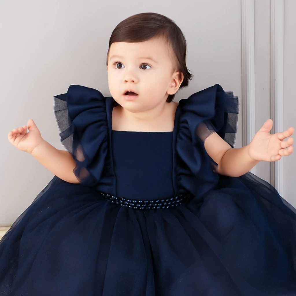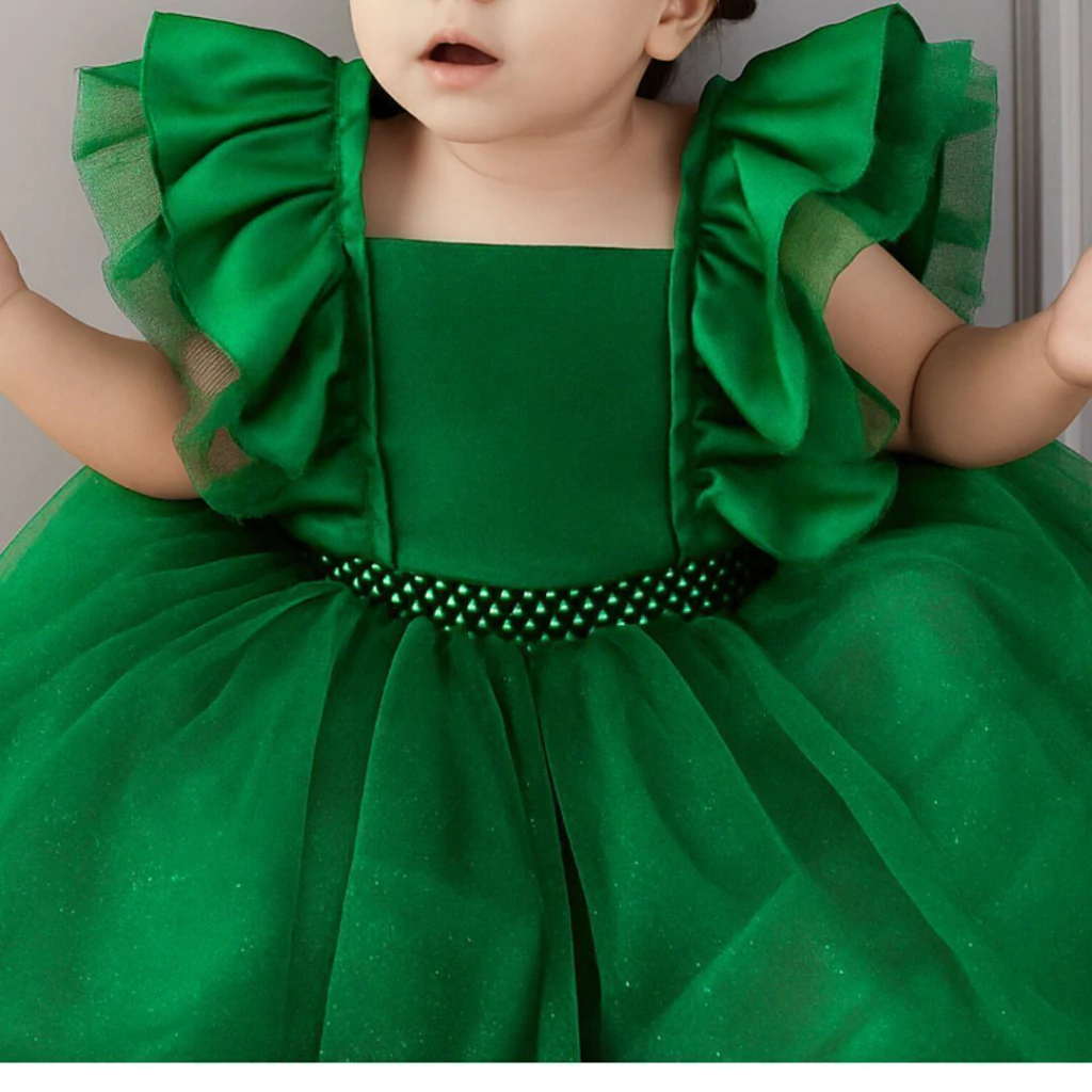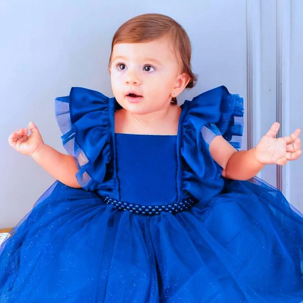 Com design sofisticado e acabamento de alta qualidade, este vestido apresenta Tule estruturado com delicados babados de tule nas mangas, que trazem volume e elegância na medida certa. A saia ampla e fluida, confeccionada em camadas de tule com brilho sutil, garante um caimento impecável e um visual encantador. O cinto de pérolas na cintura adiciona um toque de delicadeza e charme.
