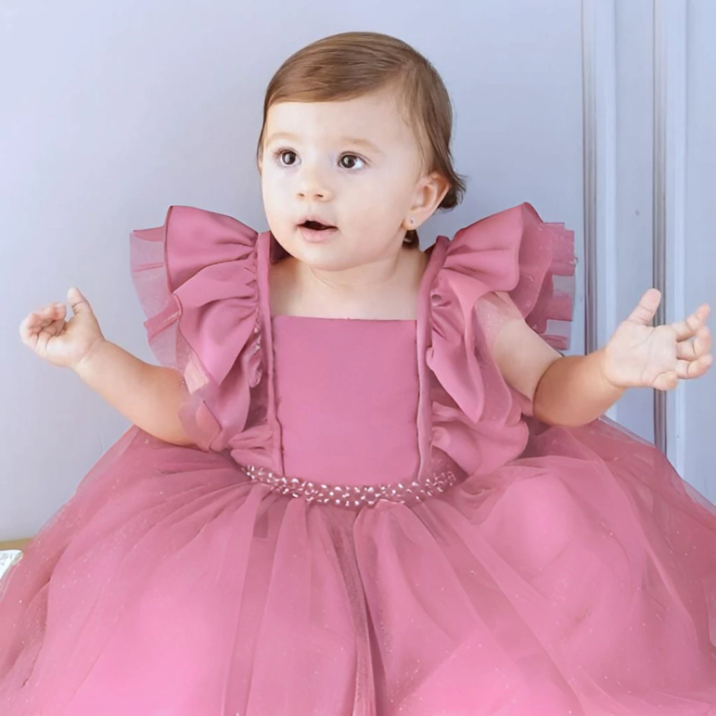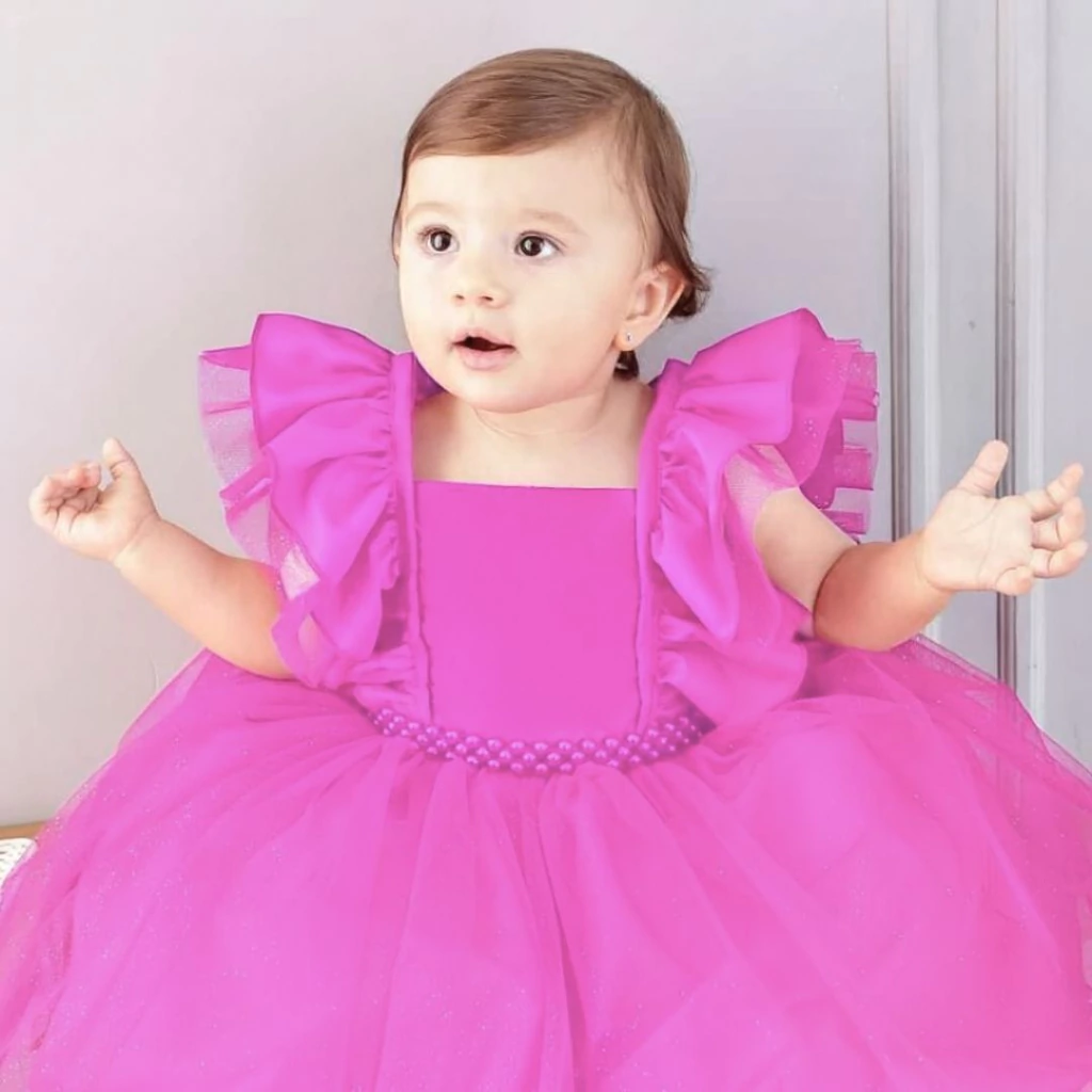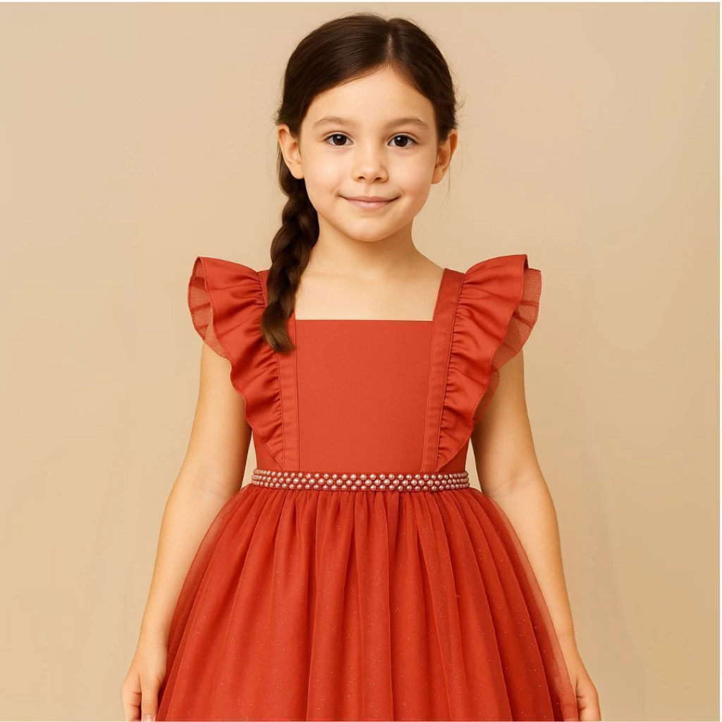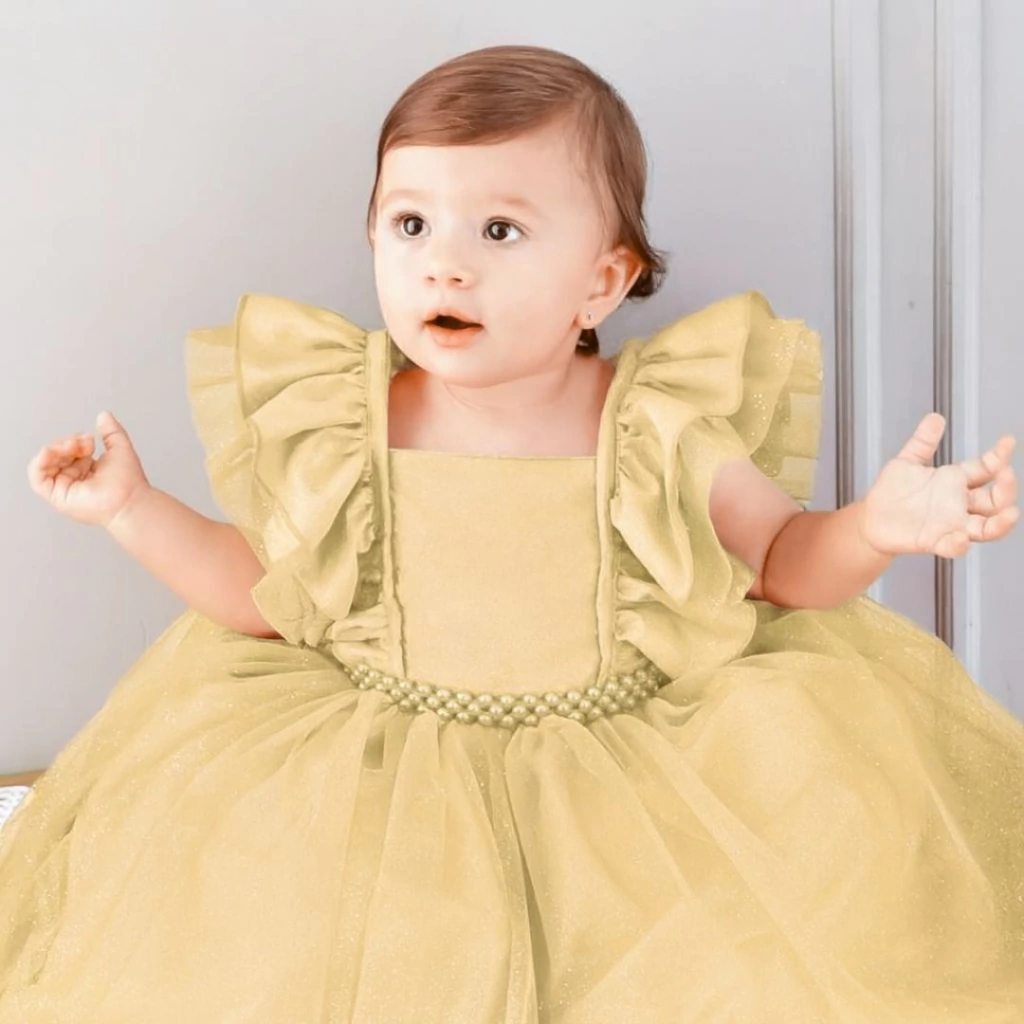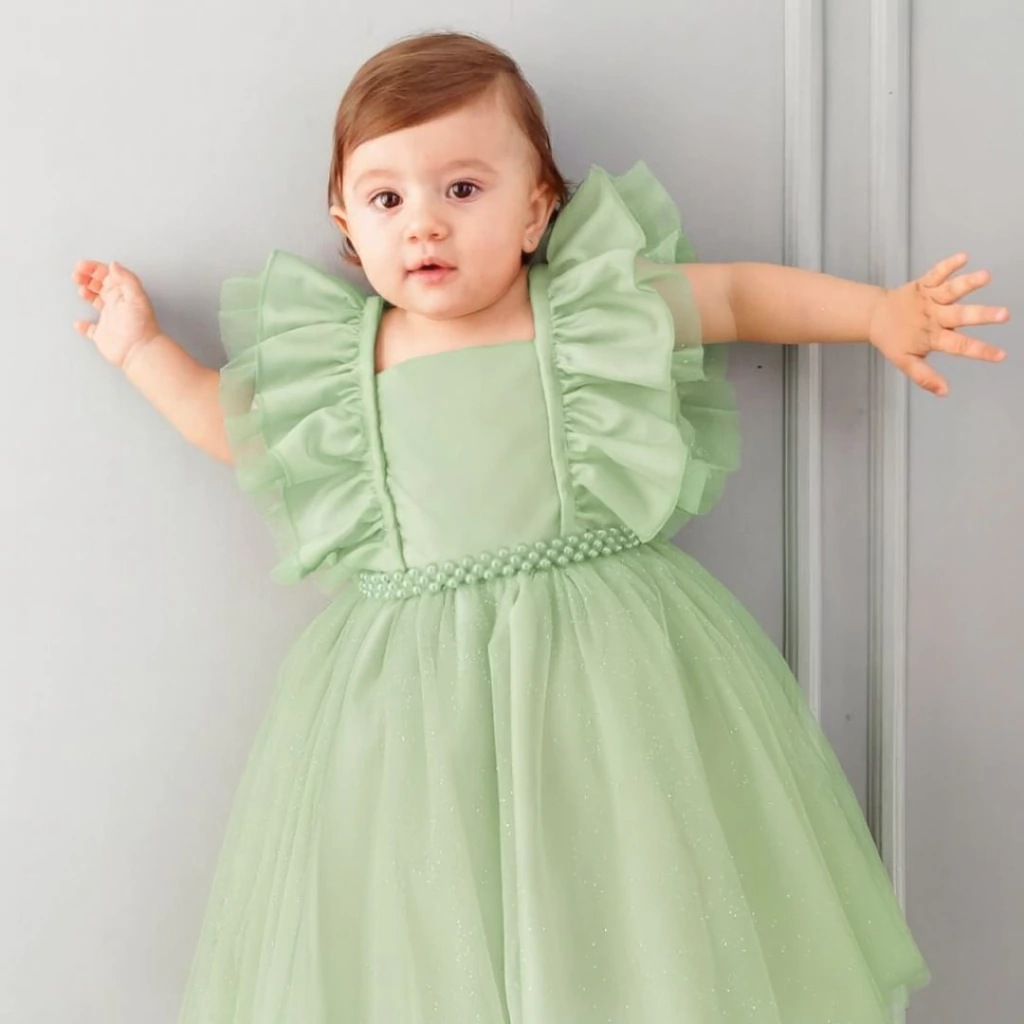 Com design sofisticado e acabamento de alta qualidade, este vestido apresenta Tule estruturado com delicados babados de tule nas mangas, que trazem volume e elegância na medida certa. A saia ampla e fluida, confeccionada em camadas de tule com brilho sutil, garante um caimento impecável e um visual encantador. O cinto de pérolas na cintura adiciona um toque de delicadeza e charme.
