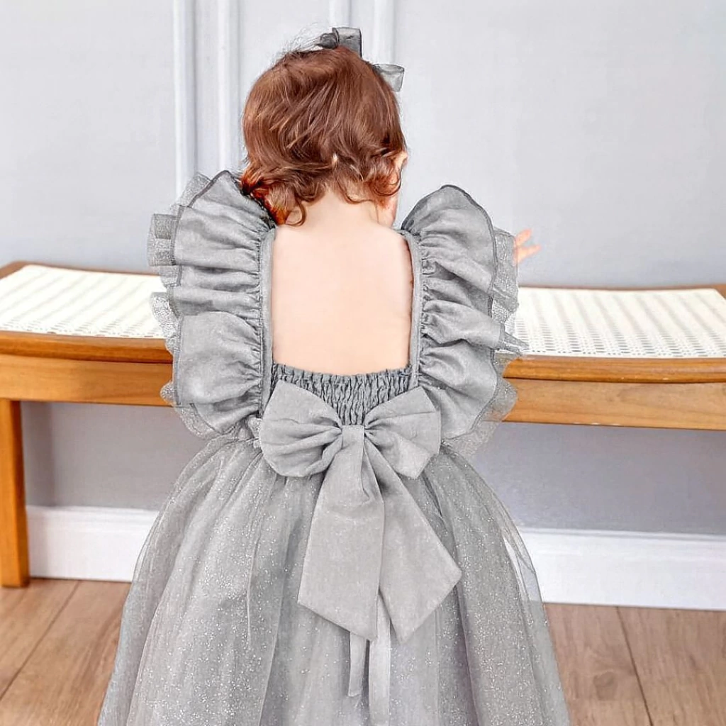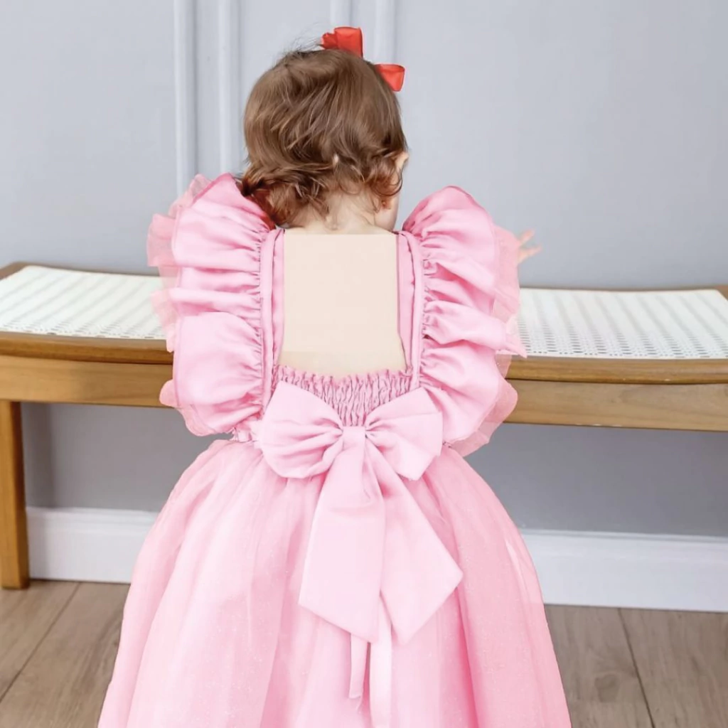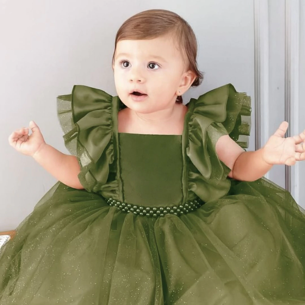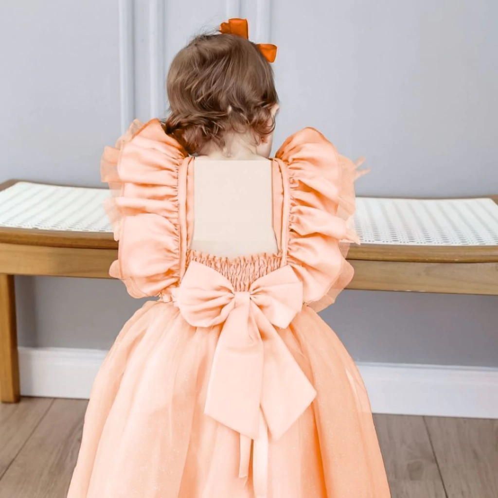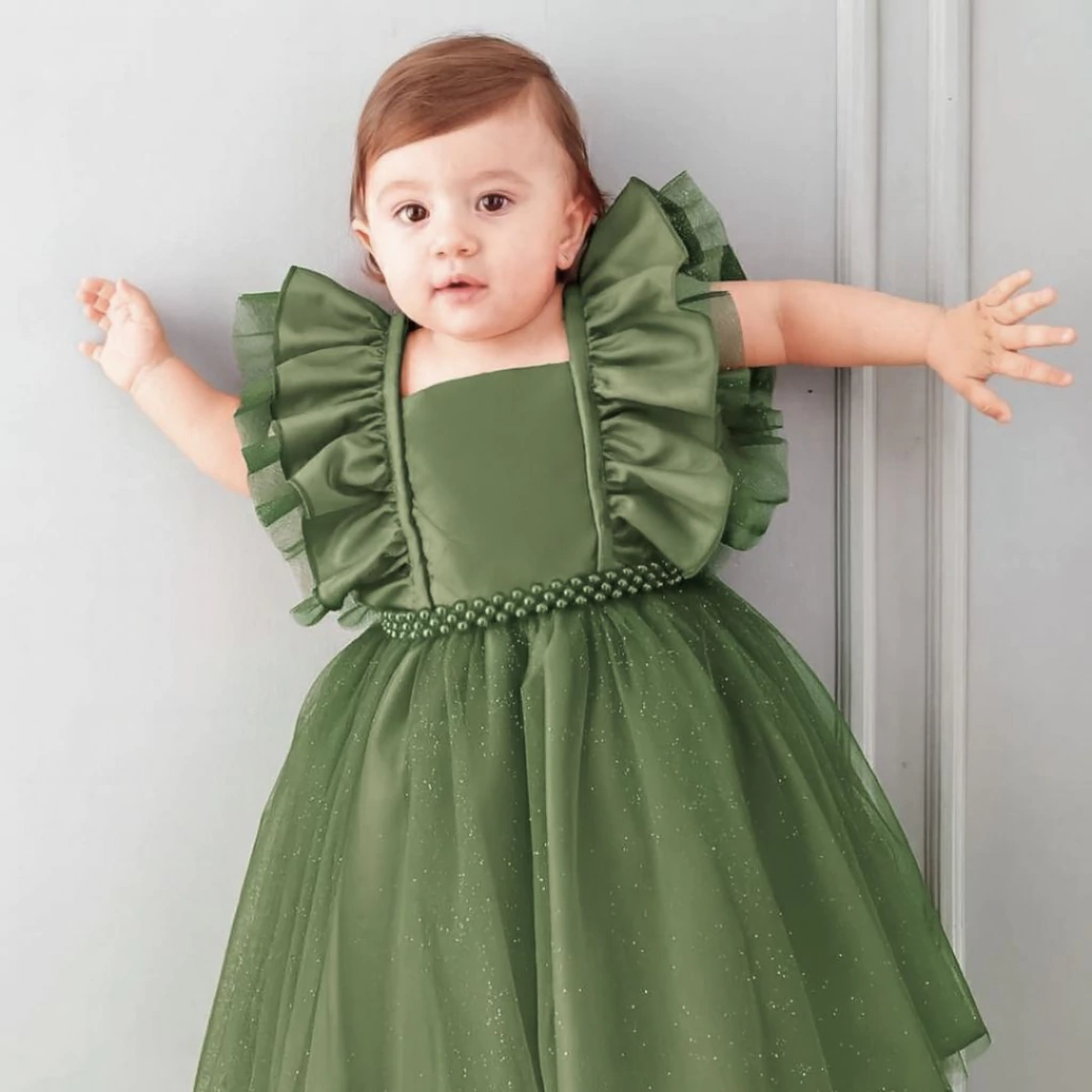 Com design sofisticado e acabamento de alta qualidade, este vestido apresenta Tule estruturado com delicados babados de tule nas mangas, que trazem volume e elegância na medida certa. A saia ampla e fluida, confeccionada em camadas de tule com brilho sutil, garante um caimento impecável e um visual encantador. O cinto de pérolas na cintura adiciona um toque de delicadeza e charme.