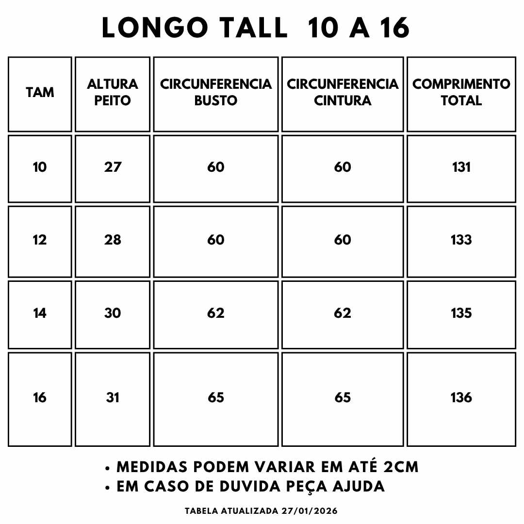 Verifique a tabela de medidas para garantir o melhor ajuste.